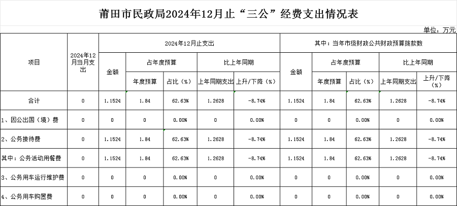 莆田市民政局2024年12月止“三公”经费支出情况表