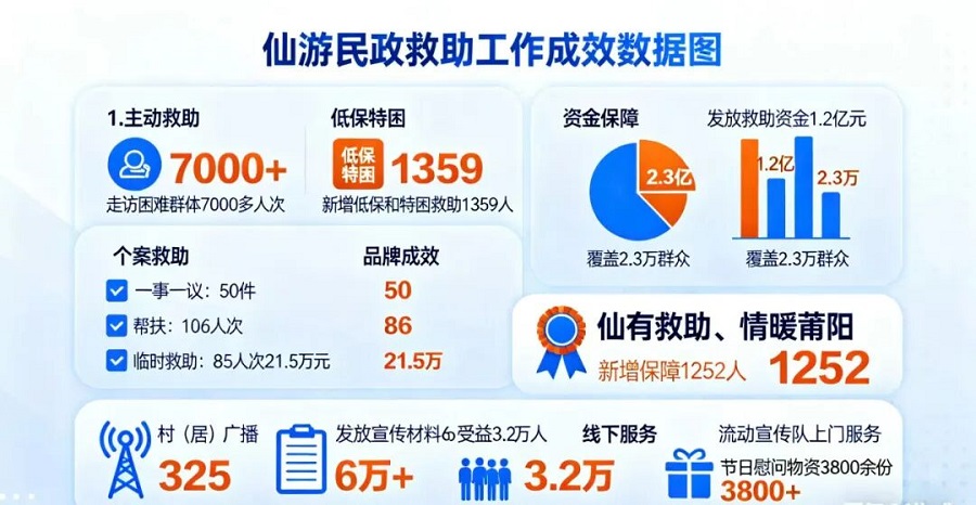 “不用跑部门,工作人员主动上门帮我办好了低保,真是太贴心了!”近日,仙游县一位困难群众的感慨,道出了当地社会救助工作的暖心转变。今年以来,仙游县民政局聚焦重点人群、重点资金、重点个案“三个重点”,以品牌化、精准化、立体化服务破解救助难题,推动社会救助从“被动应对”向“主动关怀”转型,让兜底保障更有温度。 靶向发力“三个重点”,破解救助痛点 仙游民政将“精准”贯穿救助全流程,切实解决群众急难愁盼。在重点人群帮扶上,依托社会救助联席会议机制加强部门数据共享与协作,镇村干部、专业社工主动上门服务,实现“人找政策”与“政策找人”双向发力,今年以来全县民政工作人员已走访困难群体7000多人次,帮助1359名困难群众新增纳入低保和特困救助,让困难群众“足不出户能办事”。重点资金发放方面,所有社会救助资金通过扶贫资金监管系统直达救助对象银行账户,实行“一次发、按月发、准确发”,2025年已发放救助资金1.2亿元,精准保障2.3万余名群众基本生活,守住资金安全“底线”。针对重点个案,通过专题会议集体研判,以“一事一议”模式打破政策壁垒,2025年全县已实施“一事一议”个案50件,帮扶困难群众106人次,其中21人被纳入特困供养、低保及低保边缘范围,另有85人次获临时救助金21.5万元,让特殊困难群体“一个都不落下”。