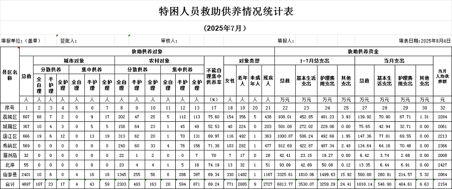 2025年7月特困人员救助供养情况统计表